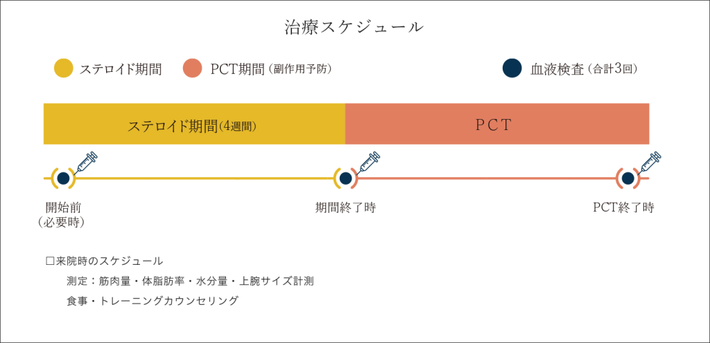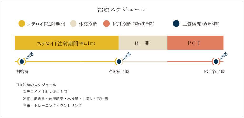 休薬期間を経て、筋肉増強治療後に現れる副作用を予防する治療「Post Cycle Therapy(PCT)」です。